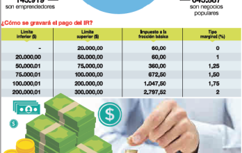 Una de las principales reformas que deben tomar en cuenta las 789.806 personas que estarán en este régimen, anota Carpio, es la forma en cómo ahora deberán pagar el Impuesto a la Renta (IR). El 2 % que se pagará en marzo de cada año, aclara, no debe verse como un valor único, sino un techo que se irá gravando progresivamente según los ingresos del contribuyente. “Para eso se ha creado una tabla que dice que en los primeros 20.000 dólares de ingresos todos deben pagar la base de $ 60, pero cuando voy al siguiente nivel, a los 30.000 por la diferencia (los $ 10.000) ya se debe aplicar la tarifa del 1% y así va subiendo mientras los ingresos se elevan”, dice.