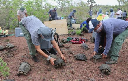 El traslado de los quelonios fue realizado por personal del PNG y del Galapagos Conservancy, que recorrió unos cinco kilómetros desde el sitio de desembarque hasta la zona de liberación en el centro de esta isla de 24,7 kilómetros cuadrados.