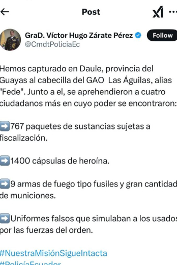 La entidad anunció la captura de alias “Fede”, cabecilla del grupo delincuencial Las Águilas, quien fue aprehendido en el cantón Daule, según informó el Comandante General de la Policía Nacional del Ecuador a través de sus redes sociales. No obstante, la publicación fue borrada horas más tarde de este mismo 30 de enero.