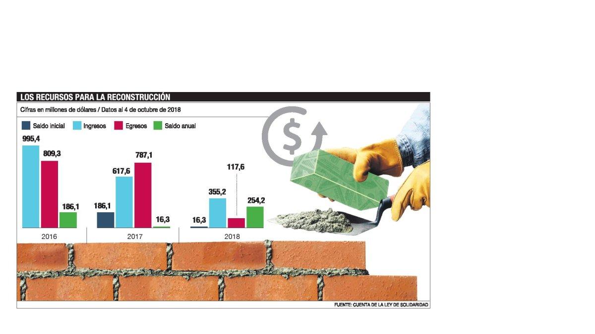 Todavía hay dinero para la emergencia. El Ministerio de Economía y Finanzas mantiene 254,2 millones de dólares en sus cuentas para atender la reconstrucción de Manabí y Esmeraldas, tras el terremoto del 16 de abril de 2016. Solo este año se han destinado 117,6 millones de dólares para las actividades.