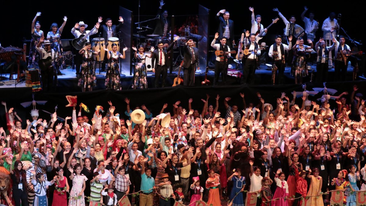 En escena están un coro, una orquesta, un grupo musical folclórico, bailarines y actores. En total son ocho grupos de baile y en cada uno hay por lo menos 20 danzantes.