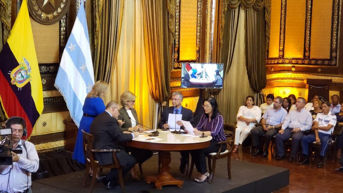 El convenio se realizó durante la rendición de cuentas semanal de la alcaldesa de Guayaquil, Cynthia Viteri, quien cumple 100 días de administración municipal.