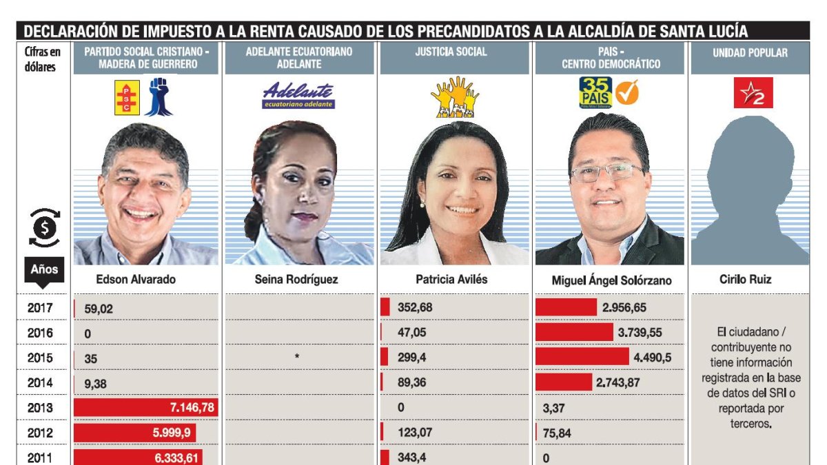Una vez más el agua entra en la contienda electoral. Es la propuesta frecuente de precandidatos a alcaldes en varios cantones de la provincia del Guayas, y Santa Lucía no es la excepción. Llevar el líquido vital a las casas de sus habitantes, sobre todo en la zona rural, es el anhelo de algunos precandidatos a la Alcaldía, incluido el actual primer edil Miguel Ángel Solórzano (PAIS - Centro Democrático), quien correrá para la reelección.