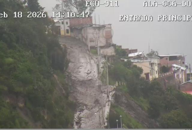 A través de las cámaras del sistema integrado de seguridad ECU911 se observó la caída de flujos de lodo sobre el cementerio de Alausí, a las 14:11 de este miércoles 18 de febrero.