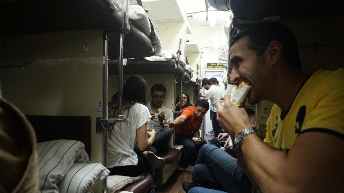 Con el paso de los minutos, aún sin arrancar, comienzan las soluciones ante la alta temperatura. Aguardientico de Antioquia, liderado por Juan Atehortua, quien ofrece a todos a su alrededor. “¿Dormir? No van a dormir, ¿no?”, pregunta Juan a varios compañeros de viaje, buscando complicidad en su intención de armar la fiesta en el tren y llegar ‘contentos’ a Saranks.