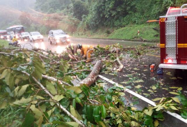 En el carril de subida, en sentido Santo Domingo-Quito, en el kilómetro 72, una gran cantidad de ramas y vegetación cubren la calzada tras la caída de los árboles.