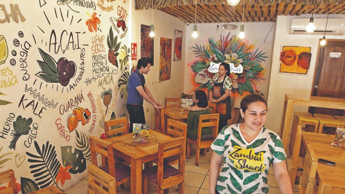 Los sitios de comida también han sido atraídos por los murales. Zambai Shack, un ‘smoothie bar’ especializado en acaí y superalimentos, ubicado en Circunvalación Sur 111-B y Víctor Emilio Estrada, tiene cubiertas sus paredes por ‘lettering’ e ilustraciones de varios talentos que han utilizado el local como escenario.