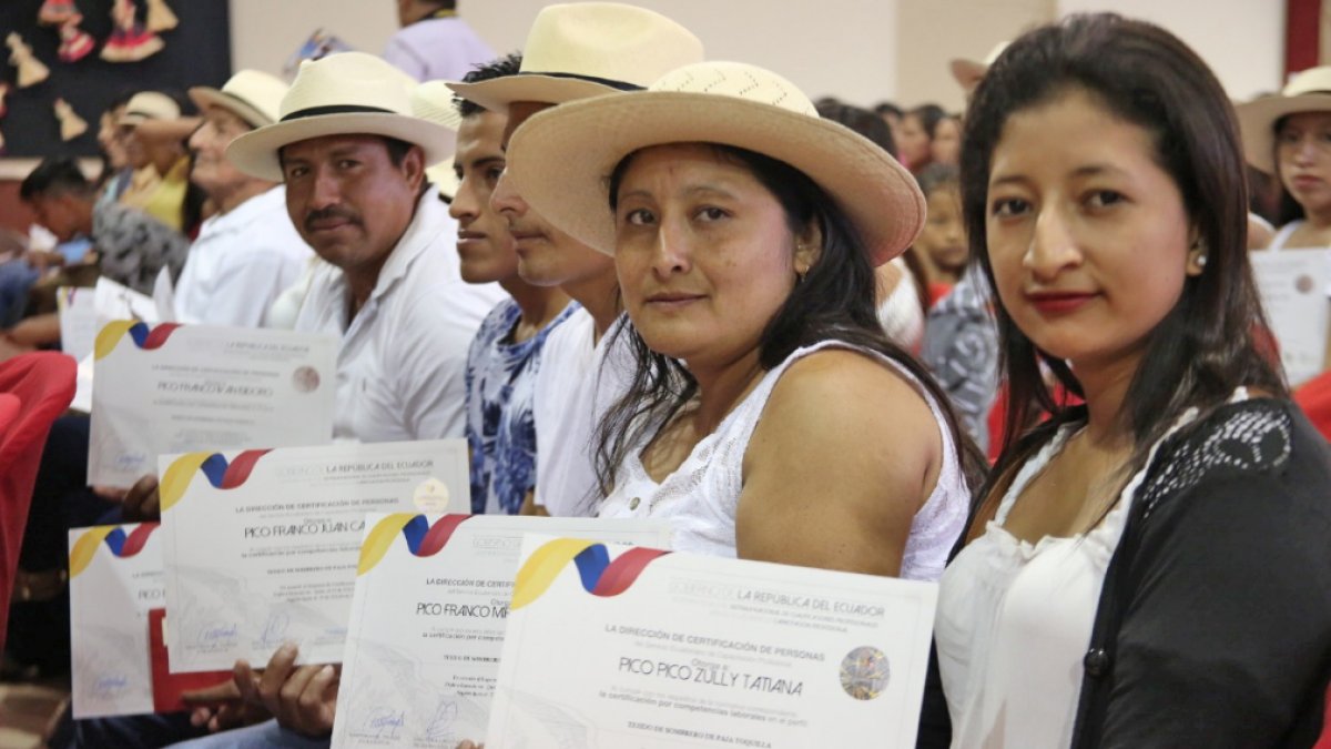 Los artesanos de diversos poblados del cantón Montecristi fueron beneficiados a través de un convenio que les permite la certificación de las competencias laborales en el tejido del sombrero fino de paja toquilla. El acto tiene el aval de la Secretaría Técnica del Sistema Nacional de Cualificaciones Profesionales, SETEC, que respalda los conocimientos de las personas expertas en esta técnica.