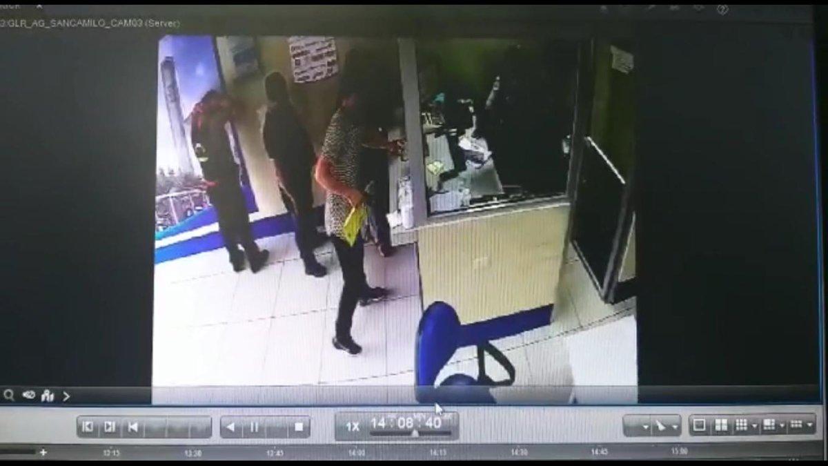 El segundo hombre —también armado— corre hasta la cajera y la intimida. Luego se empieza a caminar de un lado a otro, mientras su compañero ingresa a la cabina y le pide el dinero, producto de los pagos de la planilla de luz.