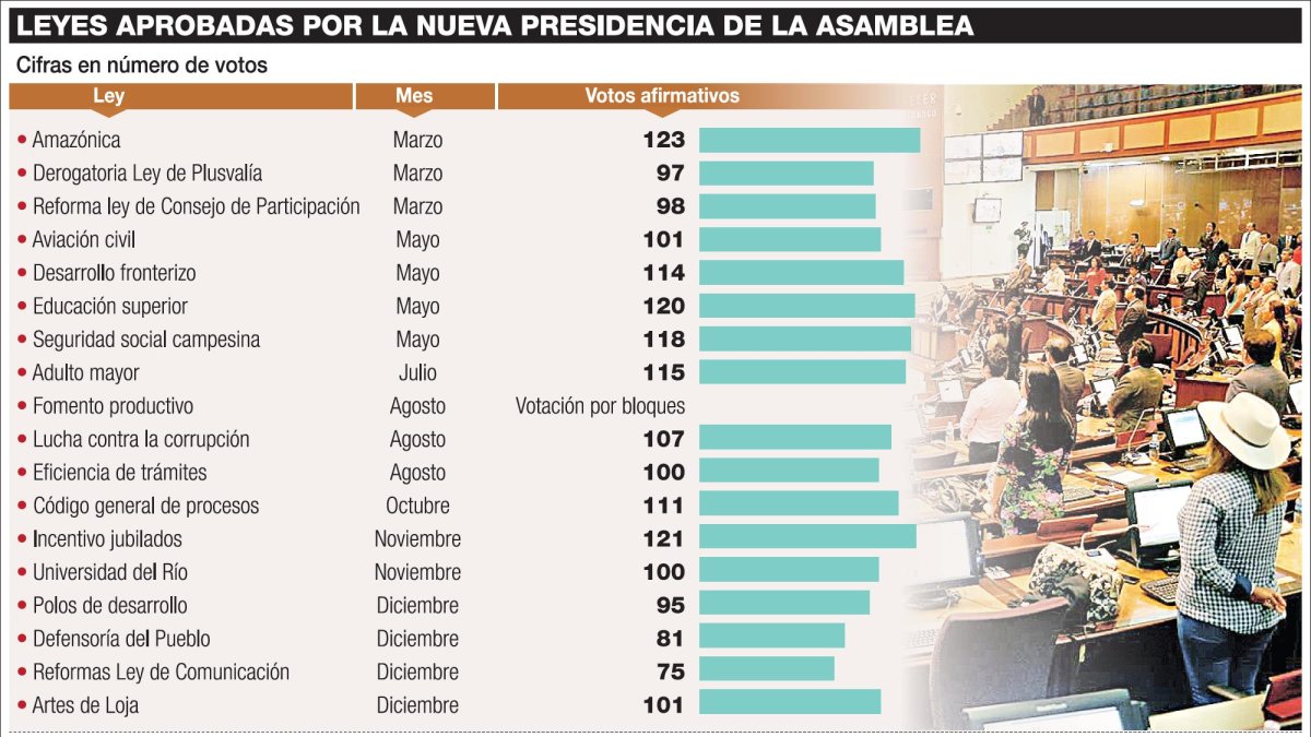 Originalmente, Elizabeth Cabezas, presidenta de la Asamblea Nacional, ofreció aprobar 48 leyes (entre reformas y nuevas normas) desde marzo hasta mayo del próximo año. Este mes, la legisladora de Alianza PAIS reconoció que, con suerte, se llegará a 28 leyes hasta el quinto mes de 2019. Una reducción del 41,6 % con respecto a la meta inicial.