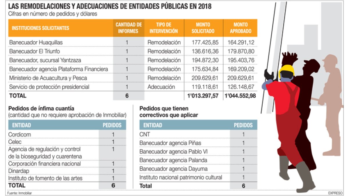 El Ministerio de Acuacultura y Pesca, de pocos meses de duración, pidió más de 200.000 dólares para remodelar sus oficinas. El Servicio de Protección Presidencial, en cambio, solicitó 119.118,61 dólares para adecuar sus instalaciones. Inmobiliar le otorgó 126.148,67 dólares para la operación.