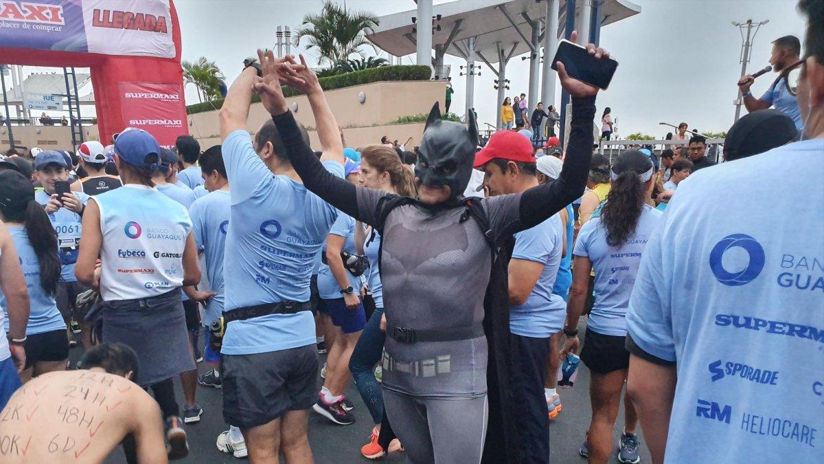 Se trata de Edison Piaun, quiteño de 38 años, quien llegó solo desde su ‘Ciudad Gótica’ con el look de Batman NRC. Es la primera vez que corre en la urbe porteña y se está preparando para la Maratón de Guayaquil, el próximo 6 de octubre.