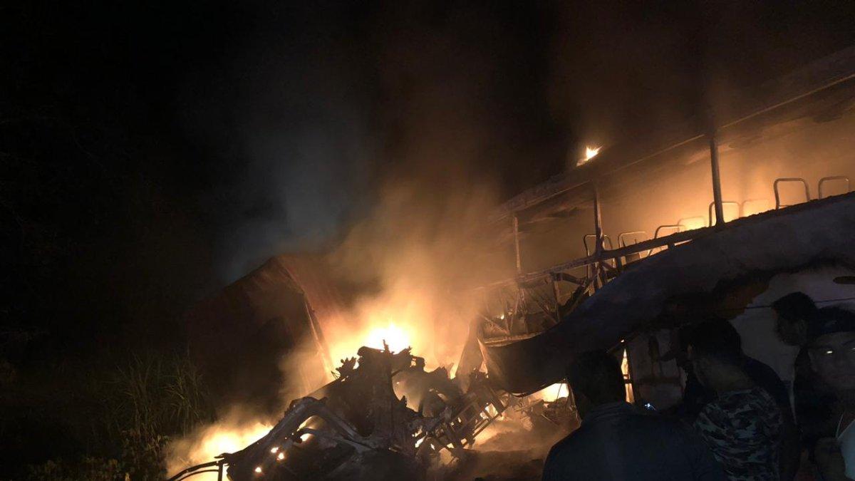 Ocurrió aproximadamente a las 04:00, cuando un bus de transporte interprovincial y un tráiler se accidentaron en el cantón Patricia Pilar. El bus, con pasajeros en su interior, se incendió tras el suceso.
