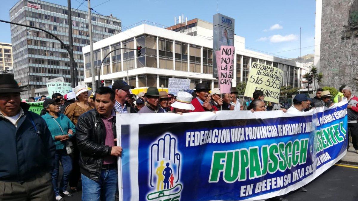 Delegados de las 23 provincias del país se concentraron en las afueras del edificio de la Caja del Seguro a la altura del parque El Ejido, en el centro norte de Quito, para movilizarse hasta el edificio Zarzuela y exigir ser recibidos por el presidente del directorio del Instituto Ecuatoriano de Seguridad Social (IESS), Paúl Granda.