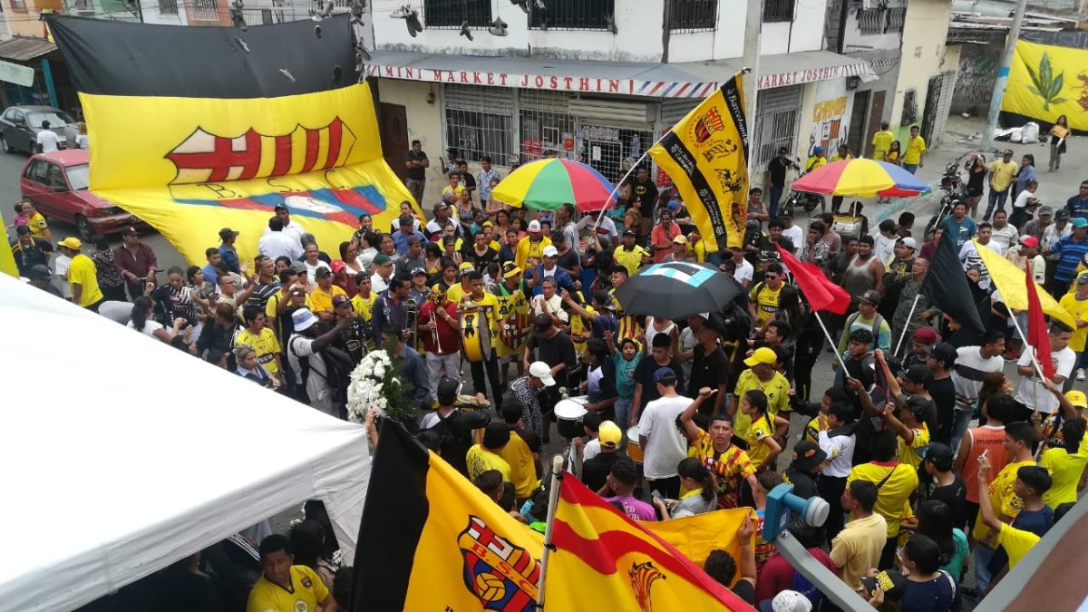 La fanaticada se dio cita en este barrio para con bombos, cantos y trompetas, despedirlos, luciendo la amarilla.