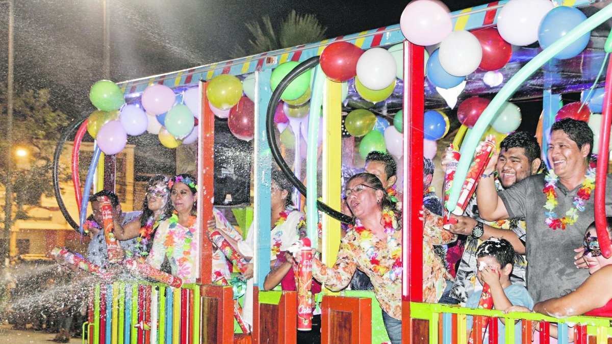 Al grito de “¡viva el carnaval!” que se escucha por doquier, vuelan la espuma y el agua. Los turistas y los visitantes se alocan. Unos cuantos tiran harina y hasta arena. La algarabía se apodera de los grupos para luego dar paso al baile. La ingesta de cocteles y cervezas aclimata los ánimos de algunos al ritmo de la fiesta.