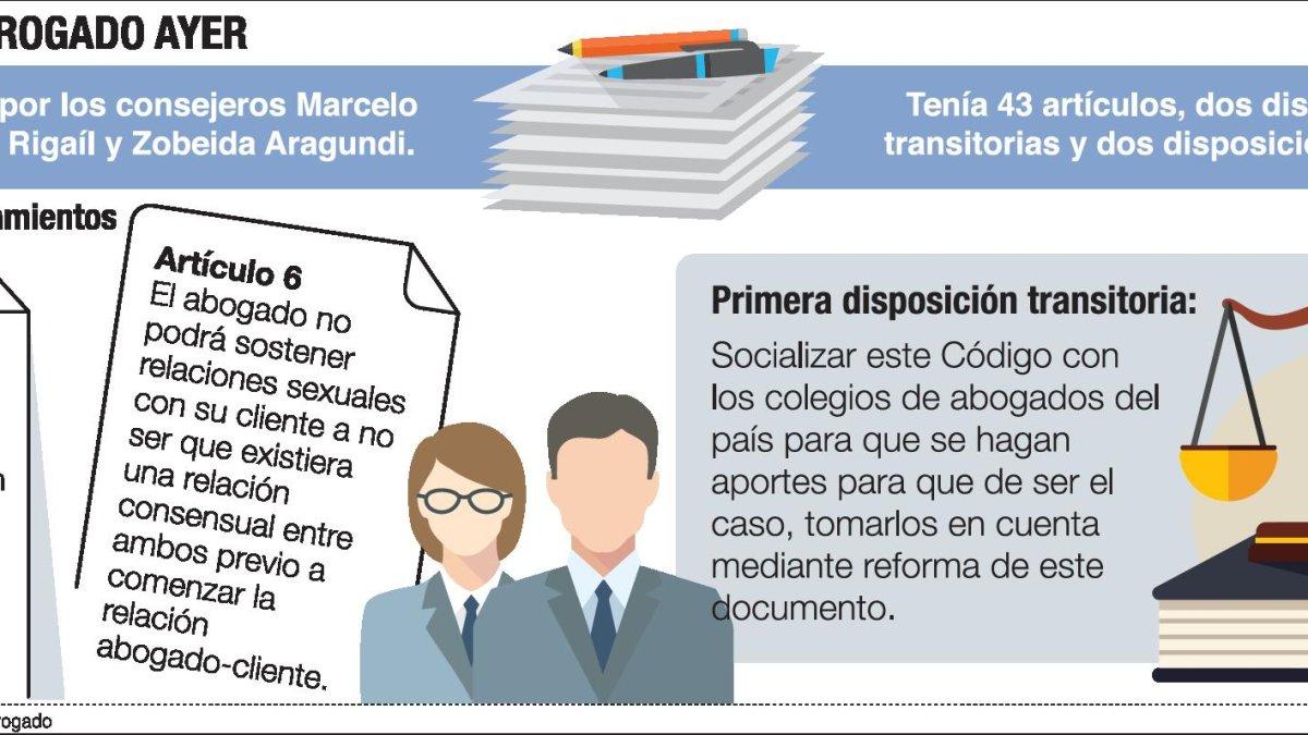 El mayor cuestionamiento al documento se encontraba en el artículo 6. “El abogado no podrá sostener relaciones sexuales con su cliente a no ser que existiera una relación consensual entre ambos...”, decía la norma que fue objeto de comentarios burlescos.