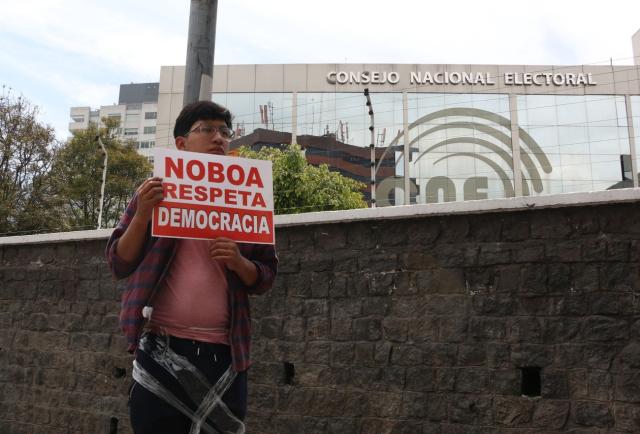 La protesta comenzó pasadas las 10:00. Con carteles y pitos, varios militantes llegaron al norte de la capital, donde se ubica el CNE. Entre los mensajes exhibidos constaban: “Unidad Popular Vive” y “Noboa. Respeta la Democracia”.