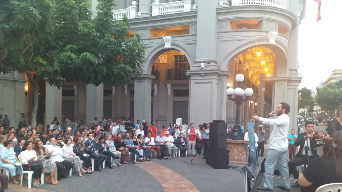 El sonido de los violines se conjugó con el de los aplausos y coros de decenas de personas que se concentraron este jueves, 4 de julio, en la Plaza de la Administración, en el centro de Guayaquil.