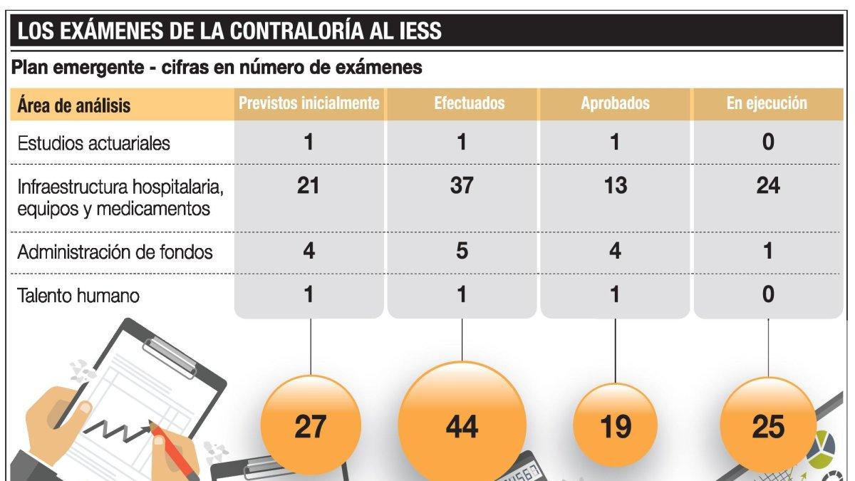 Los anuncios de sanciones e irregularidades en el Instituto Ecuatoriano de Seguridad Social (IESS) apenas empiezan. La Contraloría General tiene 25 exámenes especiales en ejecución. La atención de esos informes se centra en la construcción de infraestructura hospitalaria, equipos y medicamentos del seguro.