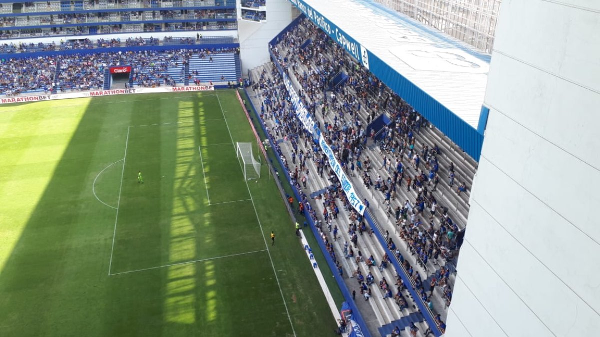 Extraño, desde ver una gran parte gris en la tribuna hasta el interminente canto procedente de ese sector. Los hinchas que lograron entrar a la platea debieron improvisar los instrumentos y un balde lo transformaron en bombo. Por ratos el puñado de hincha alboa se imponían a los cánticos azules.