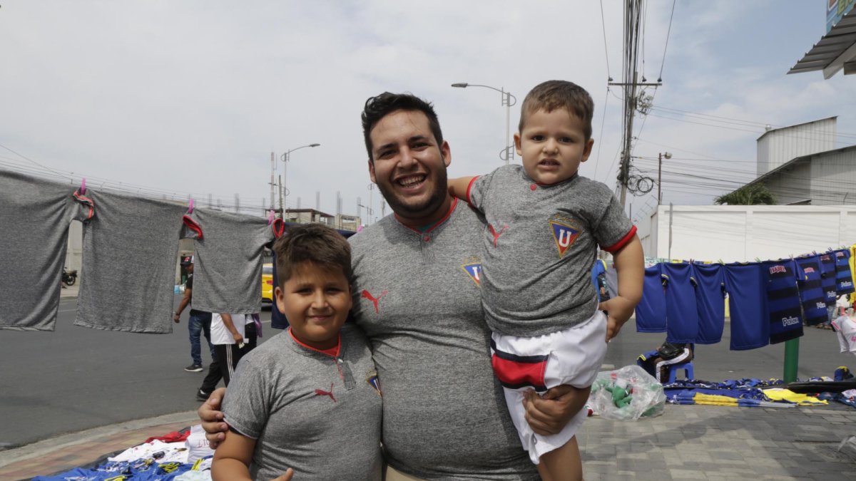 Estaban en una disyuntiva. Antoine Espinoza y sus dos pequeños hijos, Elvis y Josué, son oriundos de Manabí, específicamente de Manta, donde se disputó este domingo la final entre Delfín y Liga de Quito, pero su corazón futbolero los impulsa alentar a los quiteños, equipo del cual son hinchas por tradición familiar. A última hora buscaban las camisetas de los albos con la leyenda “Bicampeones”.