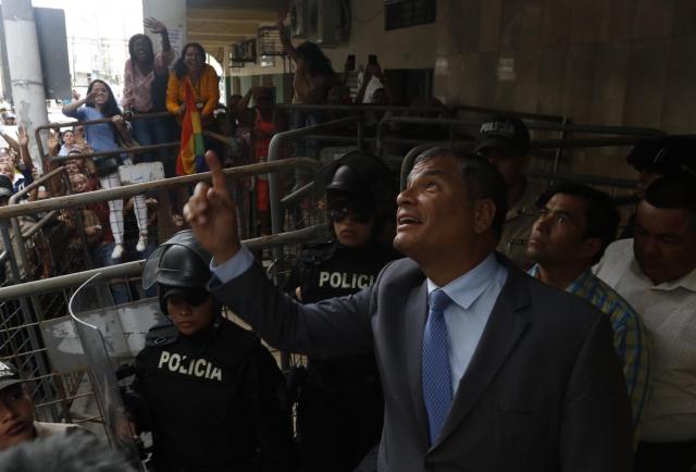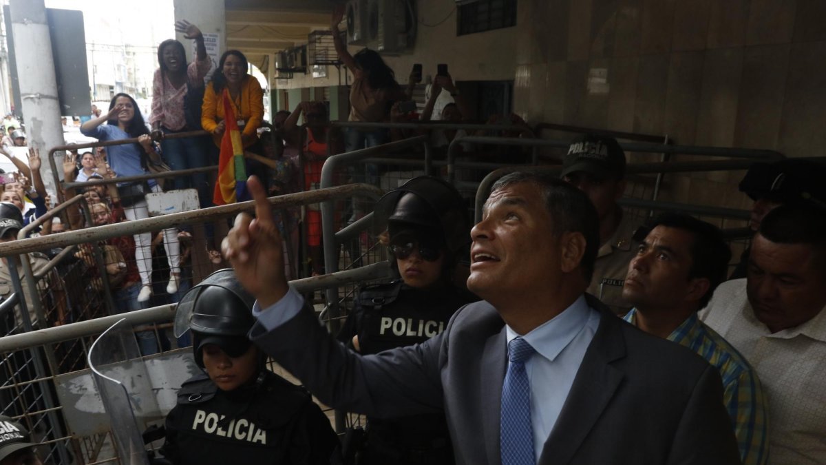 A partir de ese momento, las calles del centro de Guayaquil, sitiadas por un centenar de policías desde antes de las 09:00, se llenaron de gritos y empujones. Mientras unos manifestaban su apoyo al expresidente a viva voz, otros levantaban carteles en su contra y pedían que se prohibiera su salida del país.