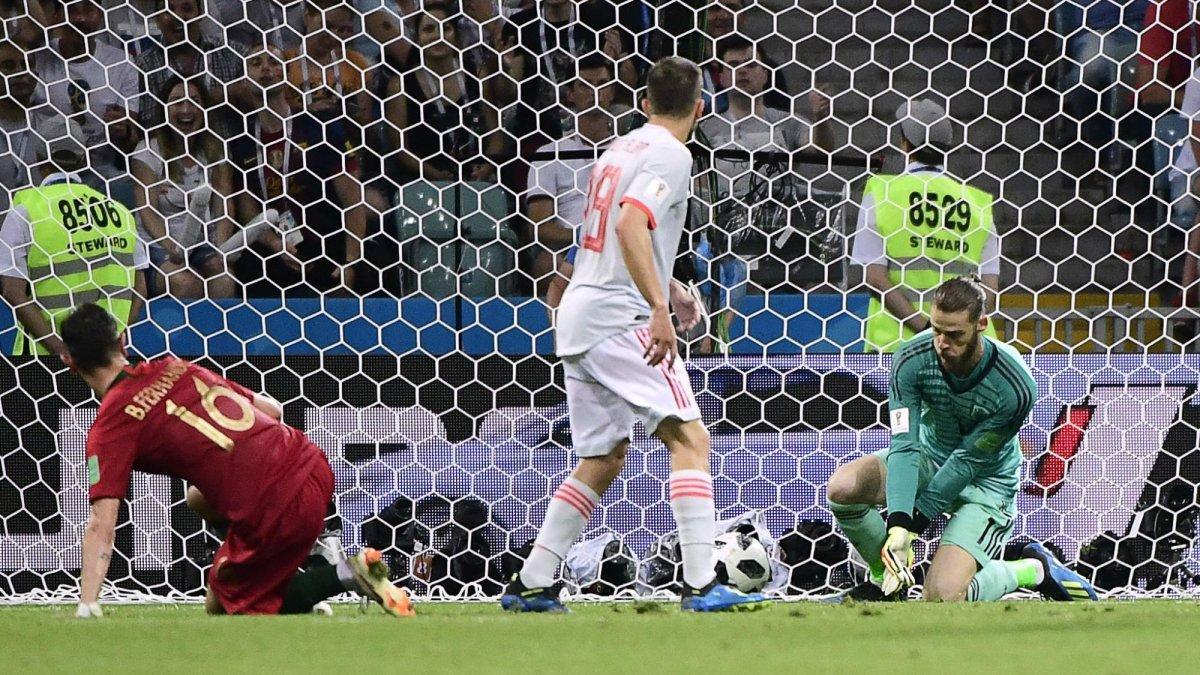 El capitán luso recibe una infracción muy cerca del área, él mismo lo cobró. El tiro sobró los espigados cuerpos de Gerard Piqué y Sergio Busquets, con un efecto hacia dentro. De Gea optó por quedarse quieto y mover la cabeza observando la dirección del balón, que selló un 3-3 de película, dirigida por Cristiano Ronaldo y con la producción del mejor torneo de fútbol: la Copa del Mundo.
