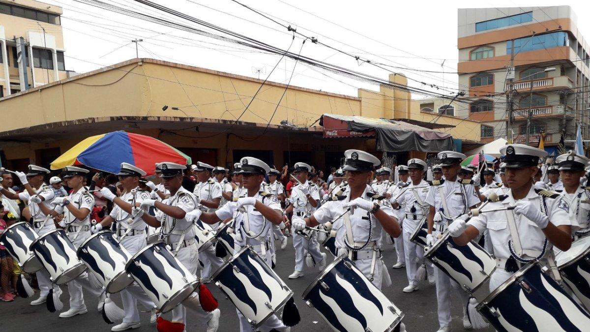 Durante seis horas (entre las 08:00 y las 14:00), los estudiantes de los planteles primarios y secundarios de esta localidad, ubicada a 50 km de Guayaquil, desfilaron a lo largo de las avenidas Piedrahita, Padre Aguirre y otras, con sus bandas de música, bastoneras y cachiporreros.