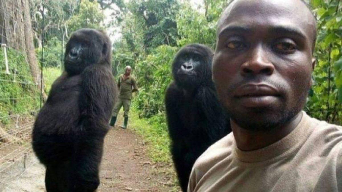 La imagen de un guardabosque junto a dos gorilas ha causado sensación en redes sociales. En la fotografía, los mamíferos aparecen posando y mirando hacia la cámara mientras el cuidador registra el momento.