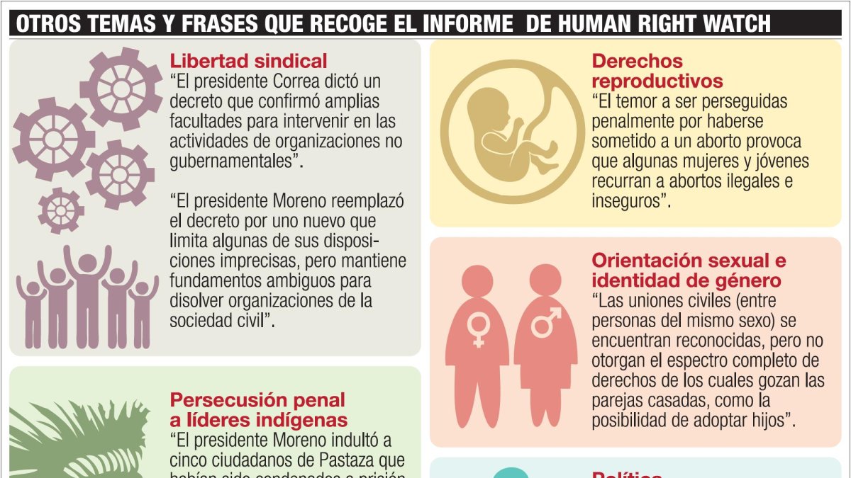 La sombra del expresidente Rafael Correa todavía mancha la tarjeta de presentación ecuatoriana en derechos humanos. La gestión del ahora opositor al presidente Lenín Moreno, a siete meses de haber entregado la Presidencia, llena de adjetivos negativos el informe anual de la organización Human Right Watch (Observatorio de Derechos Humanos) sobre Ecuador en temas como libertad de expresión, libertad sindical, independencia judicial, entre otros.