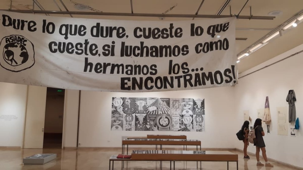 Una enorme pancarta, colgada del techo, recibe al público. “Dure lo que dure, cueste lo que cueste, si luchamos como hermanos, ¡los encontramos!”.