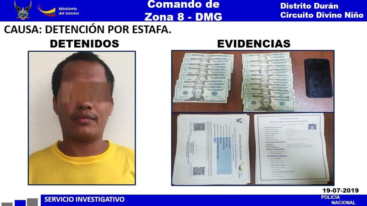 Según el general Ramiro Ortega, comandante de la Zona 8 de la Policía, el hombre fue apresado tras la investigación que desplegaron agentes de la PJ-Durán, luego de receptar alrededor de 30 denuncias, en las que lo acusaban de ofertar puestos de trabajo en el Ministerio de Educación.