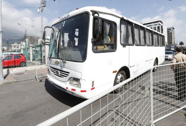 Un bus escoltado por la Policía llegó con los procesados por el caso Goleada a la Unidad Anticorrupción de Quito.Foto: Gustavo Guamán/ EXPRESO