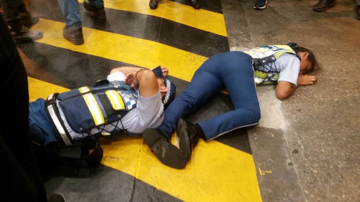 El hecho ocurrió en un centro comercial del sur de Guayaquil. Los agentes, un hombre y una mujer, quedaron tendidos en la calzada. Personas que estaban en el lugar trataron de atenderlos, pero para evitar cualquier afectación en su salud no los movieron.