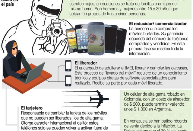 Colombia no produce móviles, solo los importa para su venta en el mercado local. De la exportación se encargan las redes criminales que operan en todo el país. Las organizaciones dedicadas a este delito controlan desde el ladrón hasta el vendedor que permite que los aparatos colombianos lleguen a los países vecinos.