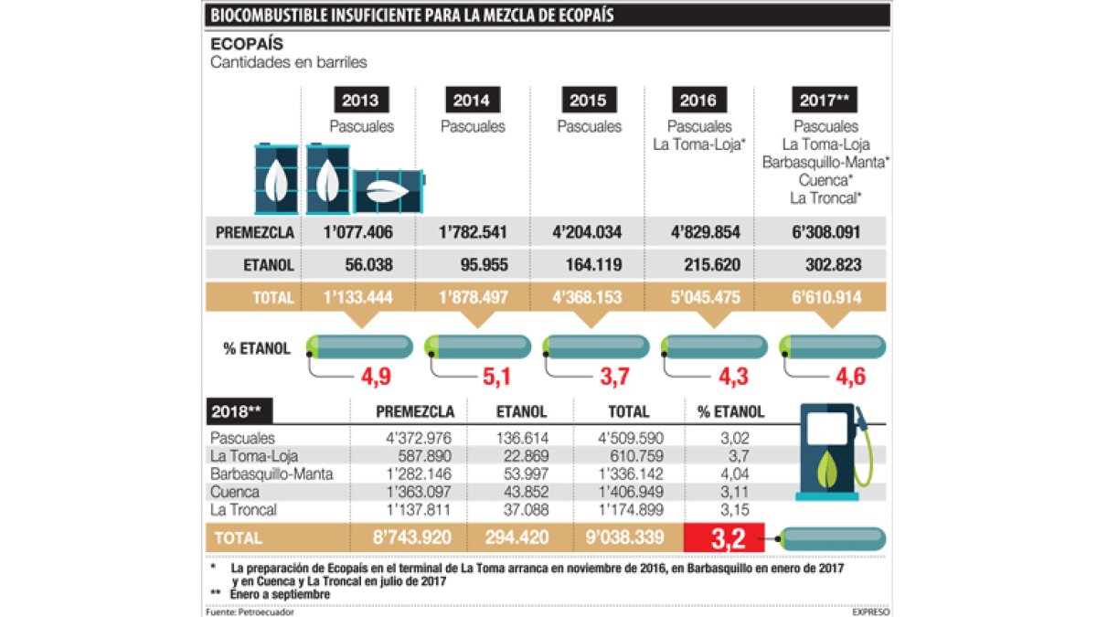 Pero la realidad de lo que se dispensa en las gasolineras dista ahora de ese anuncio. Y las cifras oficiales de mezcla de Petroecuador confirman la brecha. La ecopaís no tiene un 5 % de biocombustible (mucho menos un 10 %), sino que en 2018 bajó al 3 %.