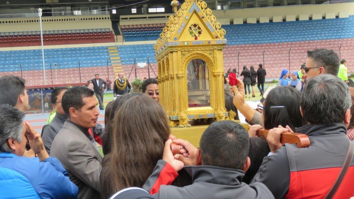 En una tarima cubierta de tela blanca y adornada con pendones rojos y decenas de arreglos florales destacaba el altar del considerado mártir de la eucaristía. A los costados se encontraba el cuadro original del Milagro de la Dolorosa y la urna de madera en forma de iglesia que guardaba las reliquias del beato, entre ellas un frasco que contiene su sangre y que, según los jesuitas, permaneció cerca de diez años líquida.
