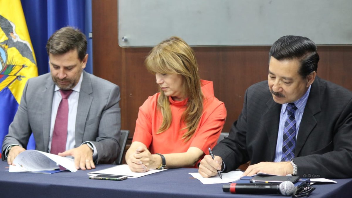 En la firma del convenio estuvieron el ministro de Producción subrogante, Nelson Guim; presidente de CEIE, Camilo Pinzón y la secretaria General de la Presidencia, Margarita Rodríguez.