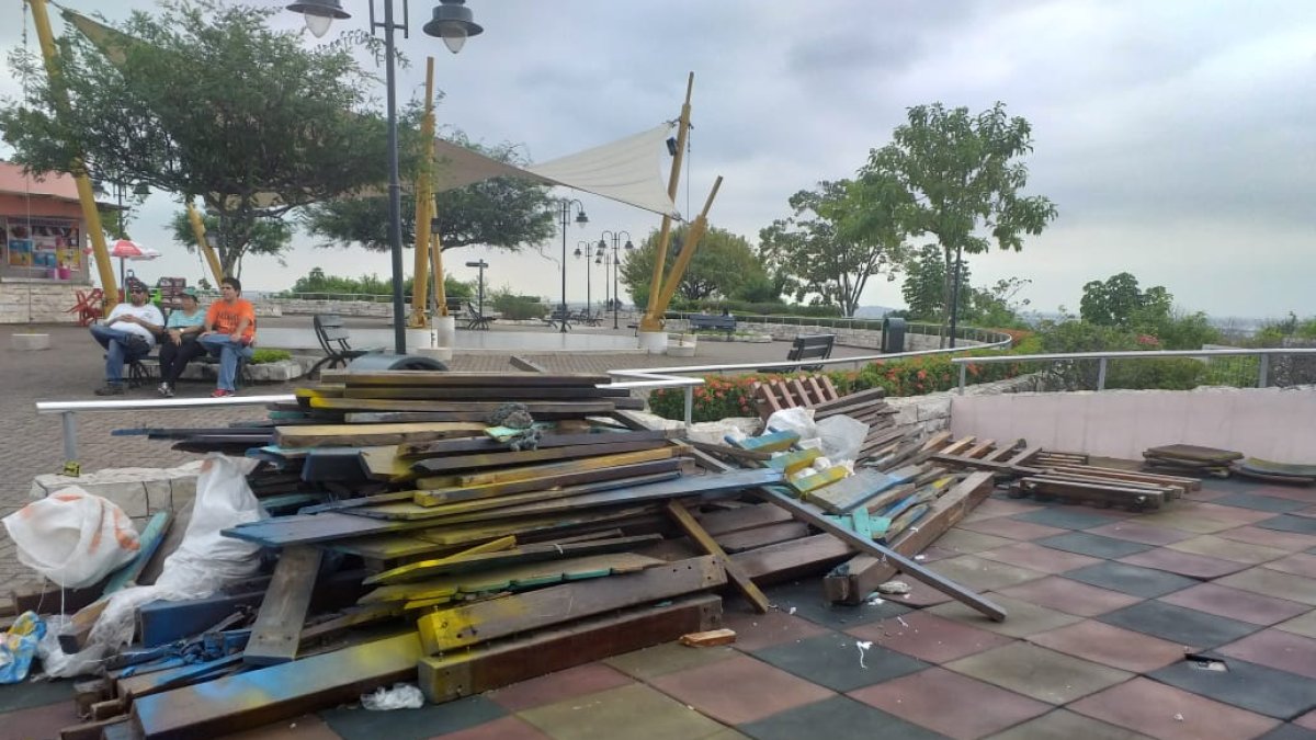 Los trozos de fierro y madera, así como los sacos llenos de desperdicios y otros desechos continúan interfiriendo en el disfrute de los juegos infantiles del mirador de la ciudadela Bellavista, en el norte de Guayaquil.