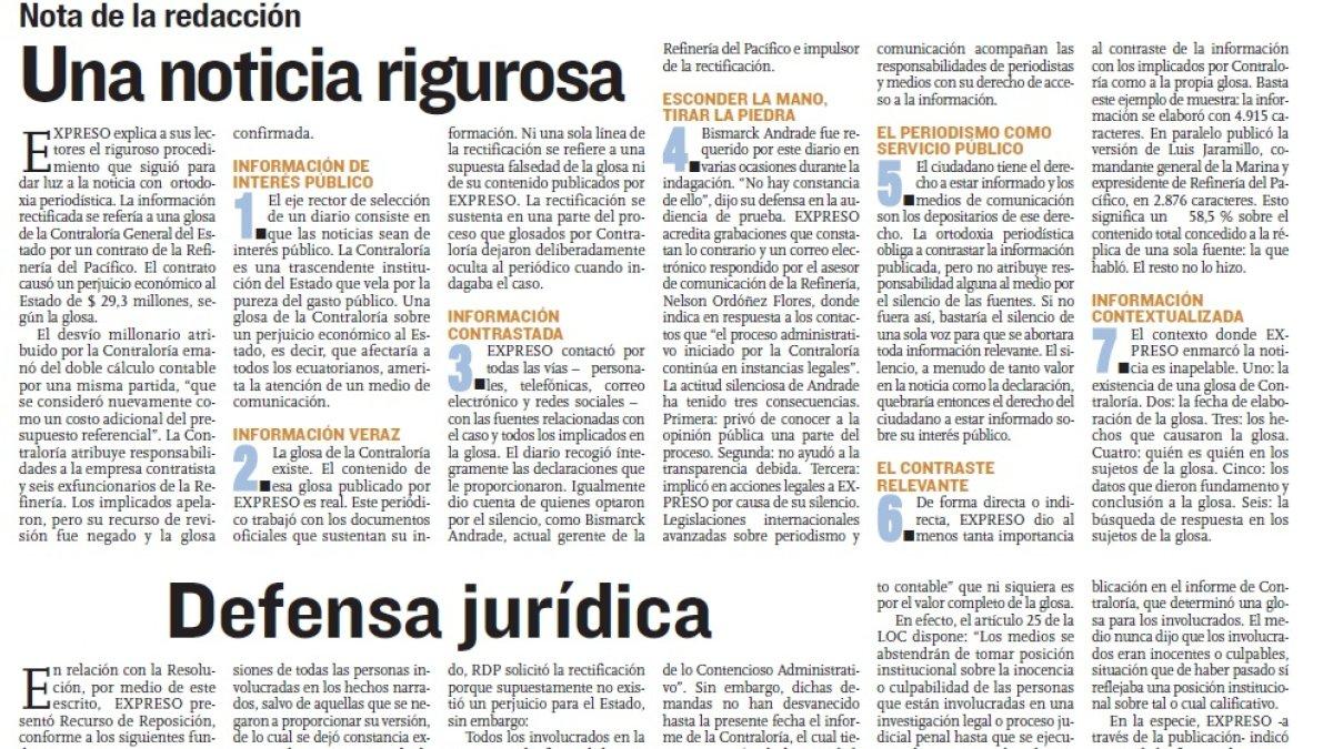 Un año antes, el organismo de control multó a EXPRESO con $ 41.000 por difundir un informe de Contraloría que establecía glosas por $ 29 millones por irregularidades en la edificación de la Refinería del Pacífico. A criterio de la Supercom, esta investigación, basada en un documento público y contrastada plenamente, “habría tomado posición institucional sobre la culpabilidad de los directores de RDP”.