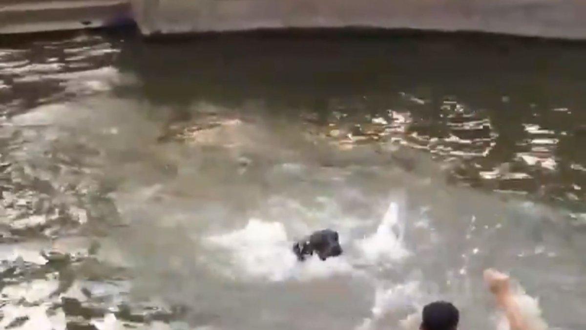Según el clip, el can —ante la llamado de emergencia— comienza a correr precipitadamente, pasando por unas mallas hasta llegar al borde del estanque. Da un salto al agua y se aproxima al hombre; este saca su mano izquierda para que el perro la muerda, llevándolo hasta las escaleras.