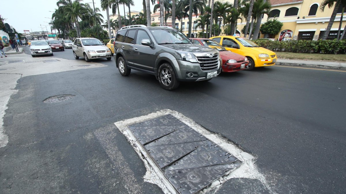 Cuando un bus de transporte urbano pasa sobre una tapa del sistema eléctrico, parte de la ‘indumentaria’ de la regeneración urbana de la avenida Francisco de Orellana, un socavón enorme se forma en el suelo. El accesorio roto provoca que los vehículos que circulan detrás deban hacer maniobras con el volante y frenen estrepitosamente para evitar el peligro en la calzada.