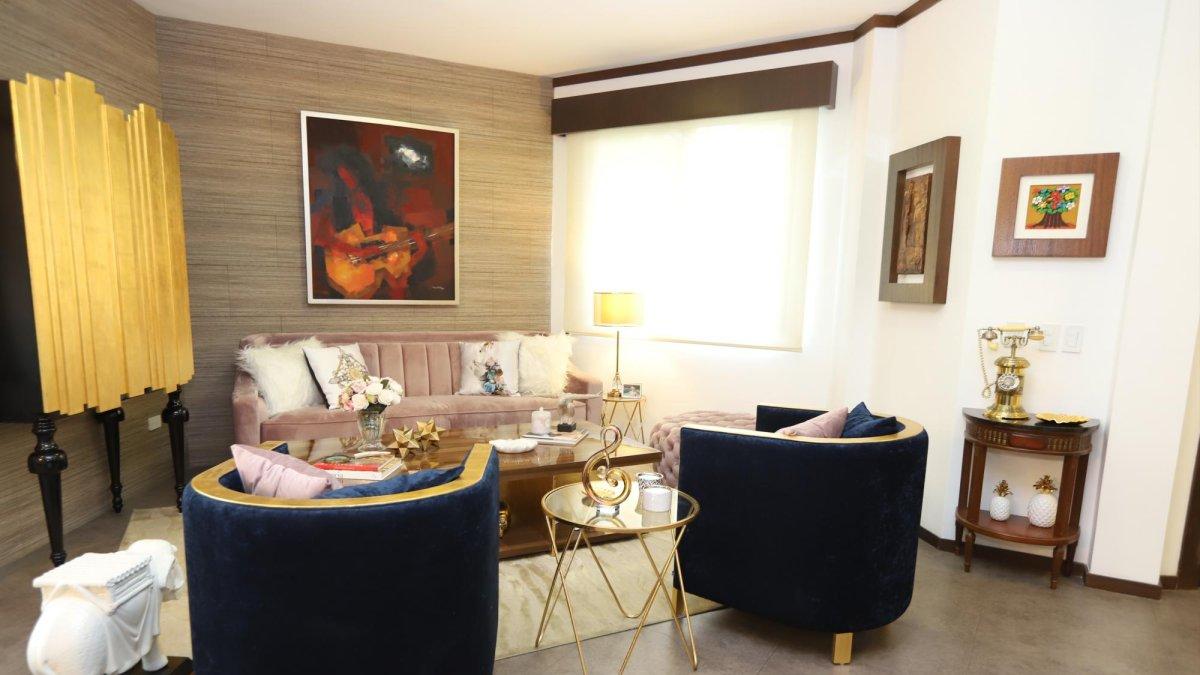 Un teléfono antiguo, comprado en un anticuario de Quito, adorna la sala. Su tono dorado hace juego con el bar, enchapado en pan de oro y otros accesorios del mismo color, que él dice está de moda. Toques de metal, vidrio, acrílico, madera, porcelanato y piedra son empleados de manera armónica.