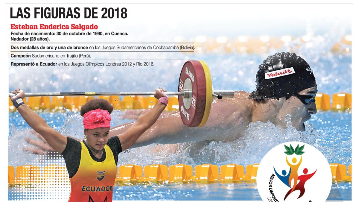 El nadador cuencano Esteban Enderica (i) recibió de parte de Carlos Martínez, asistente apoderado de Gráficos Nacionales, la placa que lo certifica como mejor deportista sénior en varones del 2018. Es la segunda vez que el crédito tricolor logra este galardón por sus triunfos internacionales.