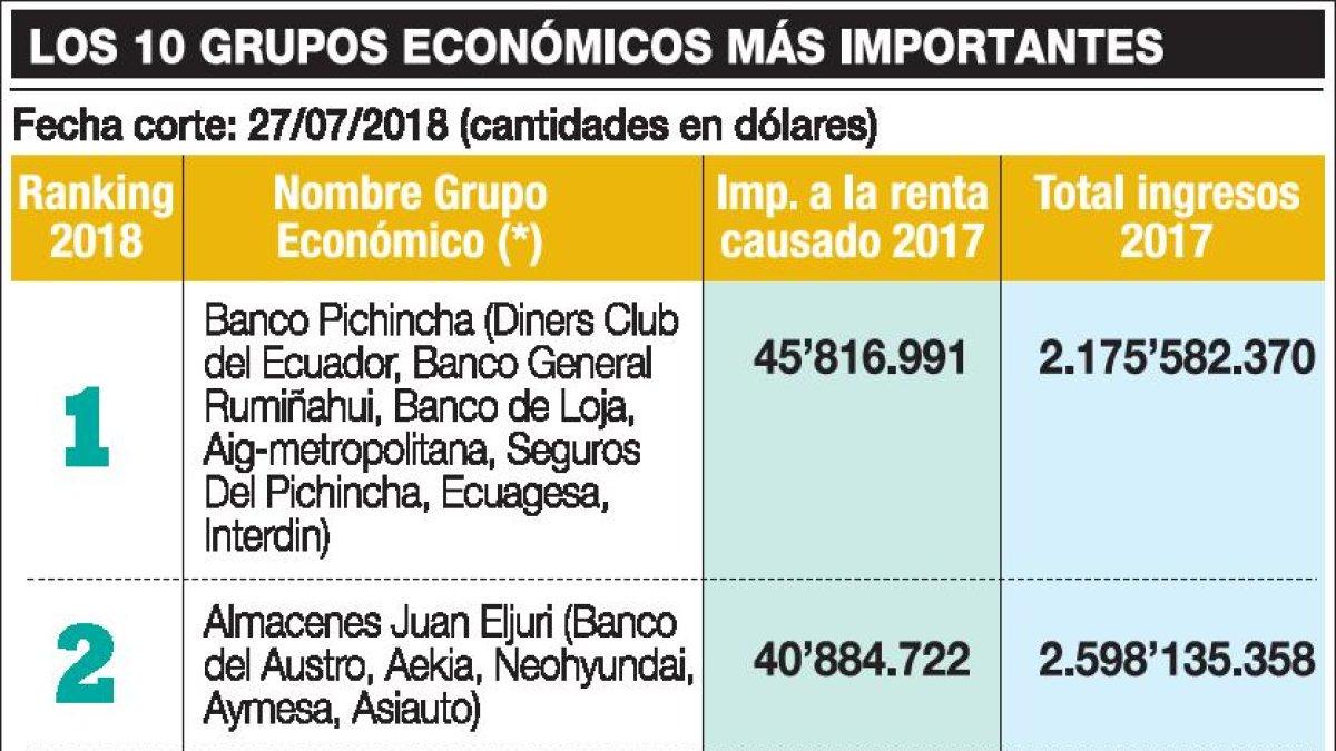 Este año, al igual que en 2017, Banco Pichincha aparece en el primer lugar del ranking. En impuesto causado esa entidad junto a sus filiales (Diners Club, Banco General Rumiñahui, Banco de Loja, Aig-Metropolitana, Seguros Pichincha, Ecuagesa, Interdin) generó $ 45,8 millones. Le siguen Juan Eljuri (con $ 40,8 millones) y Schlumberger ($ 103 millones).
