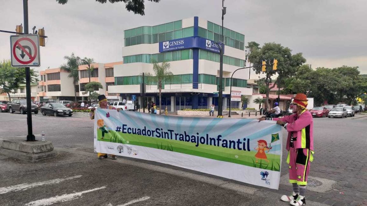 Permanecieron por 15 o 20 minutos en los semáforos de las calles más transitadas de Guayaquil. Con la ayuda de payasos, cada que el semáforo se ponía en rojo, levantaban una enorme lona que en enormes letras azules decía #EcuadorSinTrabajoInfantil.