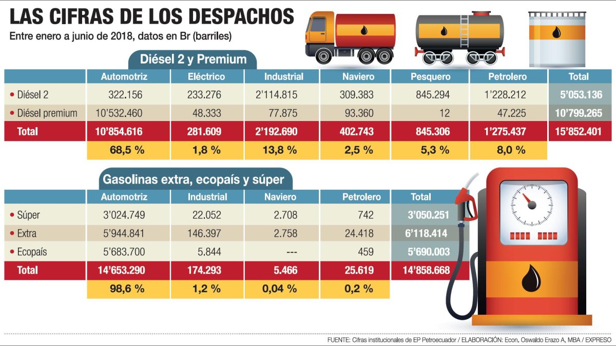 De enero a junio de este año, los tres sectores han consumido 3,4 millones de barriles del combustible, que representa el 21 % del total del consumo de diésel del país, según estadísticas de la Cámara Nacional de Distribuidores de Derivados de Petróleo del Ecuador (Camddepe).