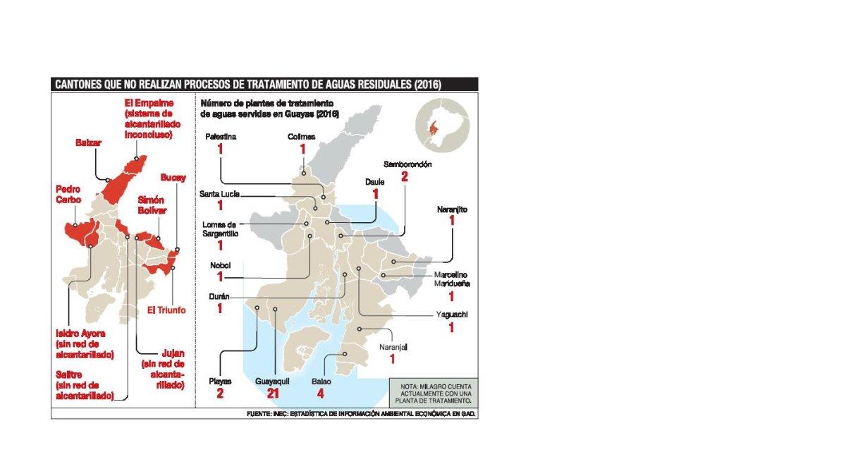 A 2016, seis municipios no realizaban procesos de tratamiento a las aguas residuales domésticas (Balzar, El Triunfo, Milagro, Pedro Carbo, Simón Bolívar y Bucay), de acuerdo con un registro que el Instituto Nacional de Estadística y Censos (INEC) entregó a este Diario. Milagro pudo salir de esa lista y hoy cuenta con un sistema de lagunas de estabilización relativamente nuevo.