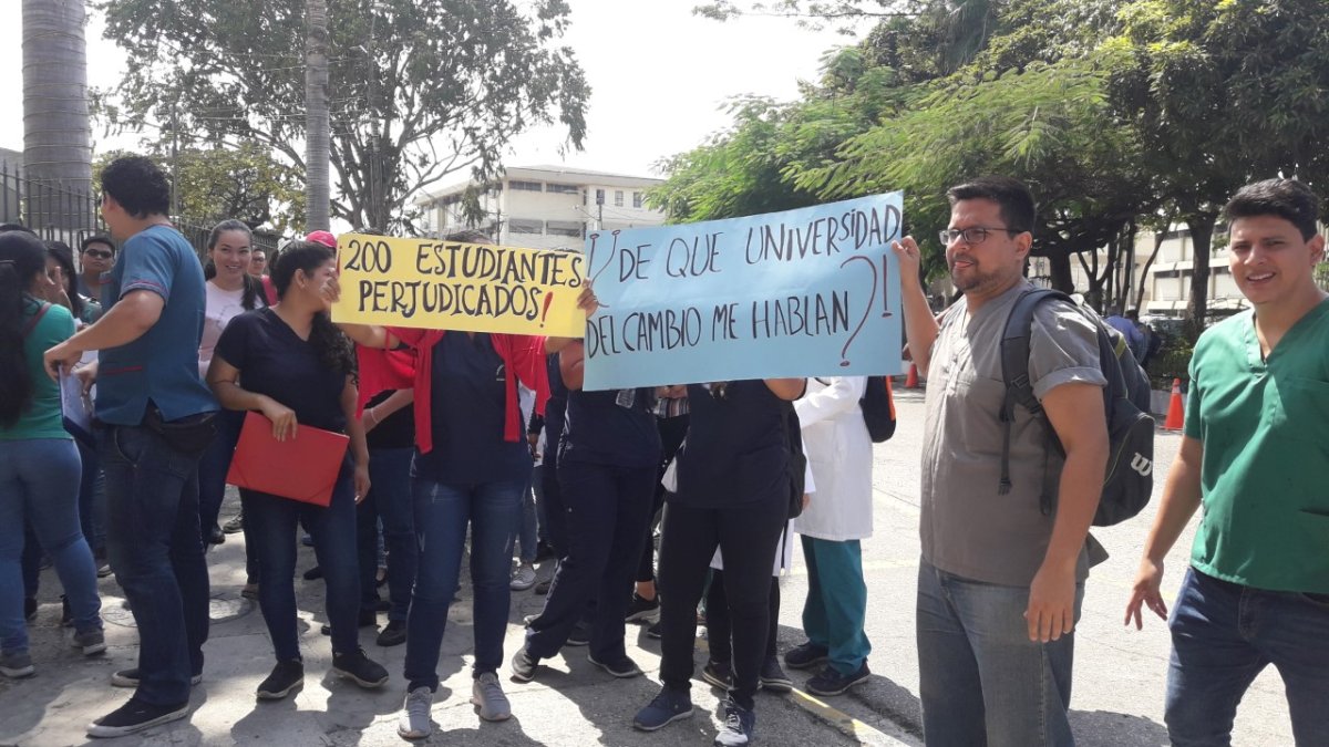 Un grupo de estudiantes de las carreras de Medicina, Enfermería, Obstetricia y Nutrición, de la Universidad de Guayaquil, realizaron este miércoles 11 de septiembre, un plantón en los exteriores del edificio donde funciona el rectorado.